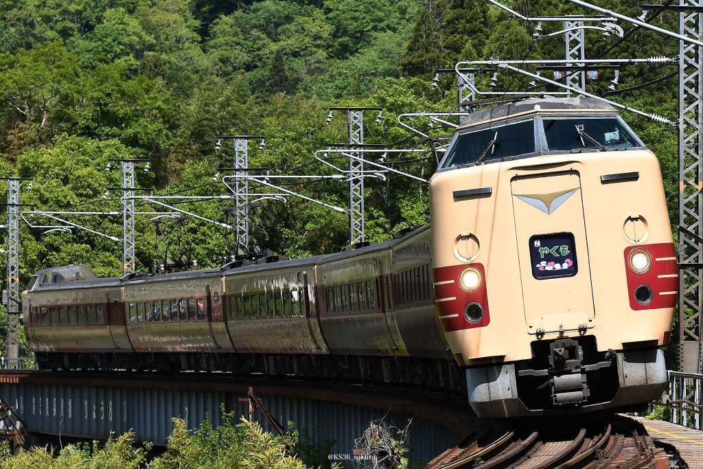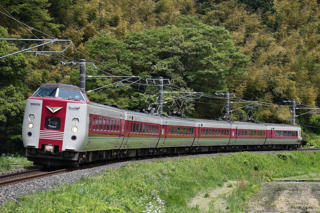 川辺をゆく381系。伯備線は高梁川と並走しているため、川沿いは伯備線らしい構図と言える。