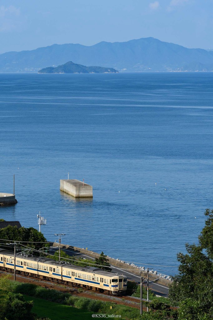 同行者の方にご案内頂き、瀬戸内海バックに順光で打てる俯瞰場所へ。高低差の具合で、夕方の光線では木の影が3両目付近にかかってしまうため、思い切って縦で。