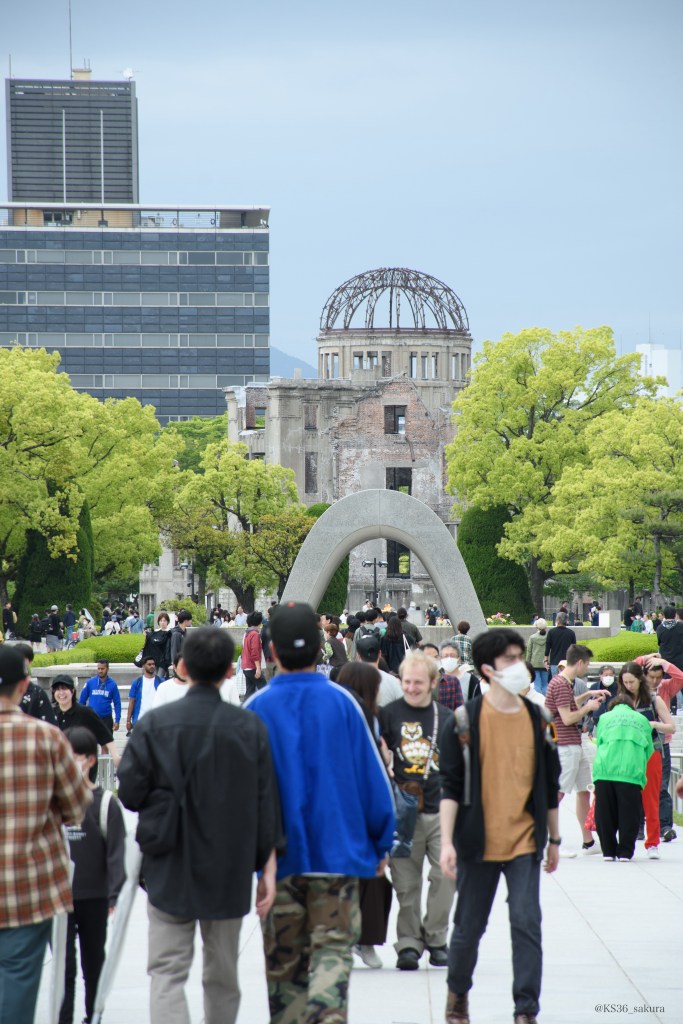 テレ側で前ぼけを作った場面です。f8でも周辺減光が見られます。また、左上のビルに注目です。水平を取ったのに歪みの影響で傾いているように見えますね。ピント面の原爆ドームはまずまずです。