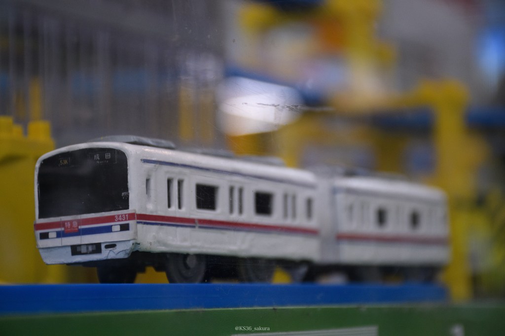 近接の画面。ショーケース越しにプラレールを。このレンズの最短撮影距離はズーム全域で45㎝です。